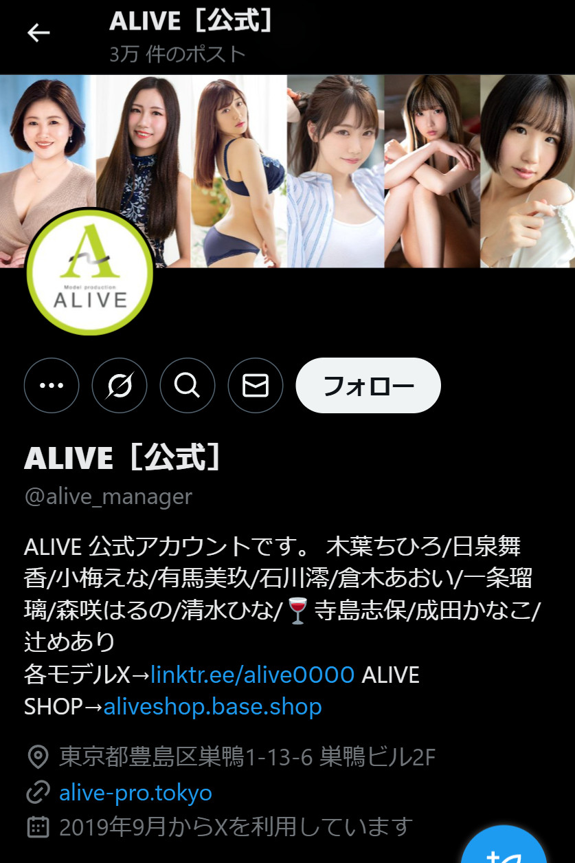 アライブに関して、インスタグラムやX(旧Twitter)に「アライブ公式」のアカウントや、所属女優のアカウントが見つかりました。実態のあるAVプロダクションの求人情報だと判断できます。